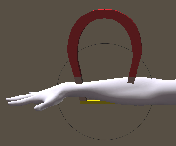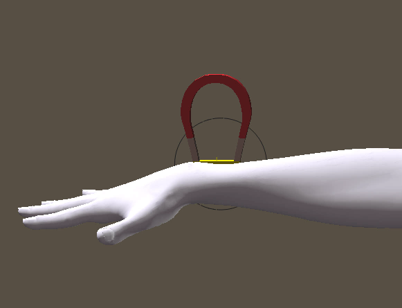Select the magnet base, and then scale and position the magnet over the right forearm. Then scale and position the magnet zone to surround an area along the top of the forearm.