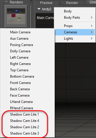 Shadow light cameras are very useful for aiming lights and creating their shadows. Each light in your scene has one Shadow Light camera. Each shadow camera shares both XYZ location and aim direction with its assigned light. Poser uses these cameras to calculate shadows cast by the objects in each light’s path. Positioning these cameras and/or adjusting their parameters/properties can affect how shadows appear in your rendered scenes. You can select these cameras using the Select Actor pull-down menu. Shadow cameras have a reduced set of properties/parameters (see Camera Properties & Parameters for more information).