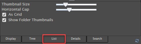 When the Item List is enabled, thumbnails appear in multiple columns that adjust to fit the width of the panel. Settings in the List Options section control size of the thumbnail and the placement of text around the thumbnail.