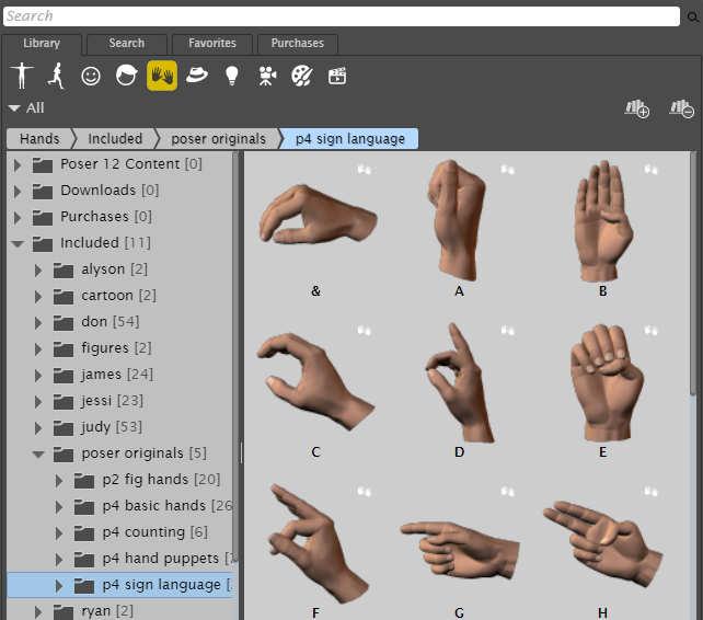 This Library palette category houses hand (*.HD2) files, which can be applied to your currently selected figure. Hand files are subsets of Pose files that only contain positioning information for the hand and its children (fingers). Hand poses contain both finger positions and wrist positions.