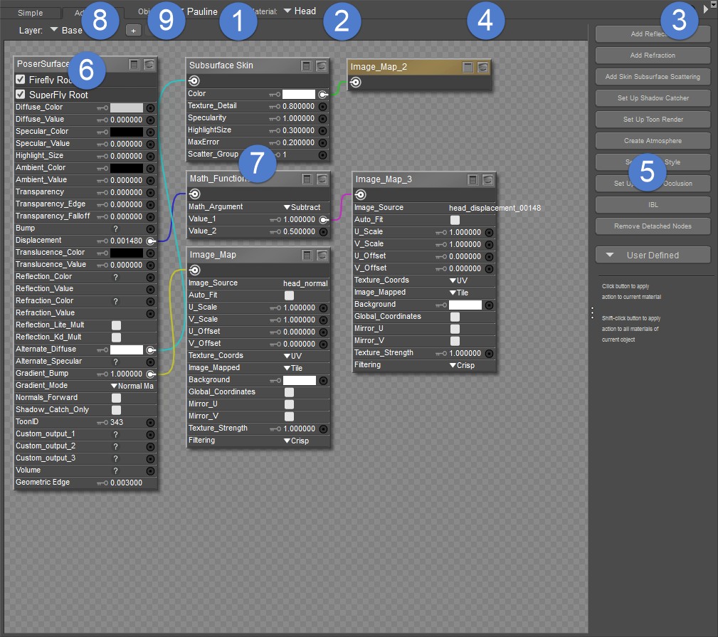 The Edit view of the Material room is where you build shaders by working with nodes. Please refer to Working with Nodes and Root Nodes for more information about shader nodes and how they function within Poser.