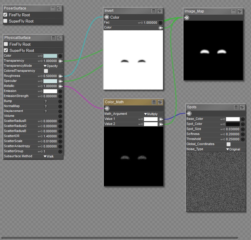 •A 3D Textures > Spots node is used to simulate metallic flakes. A Color Math node multiplies the spots with the eyeshadow mask to only apply the spots to the eyeshadow. Then it connects to the Metallic input of the Physical Surface node, with the value set to 1.