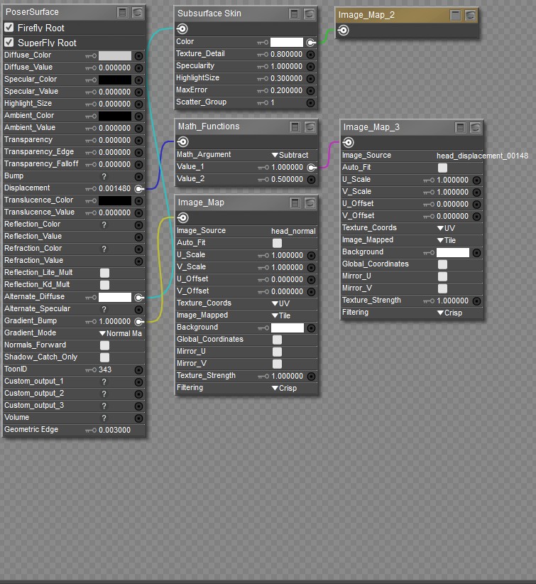 •Add Skin Subsurface Scattering: Clicking the Add Skin Subsurface Scattering Wacro button will apply a Subsurface Skin node to the selected material. The node will be attached to the Alternate Diffuse input of the PoserSurface node, and the Alternate Diffuse color will be set to white.