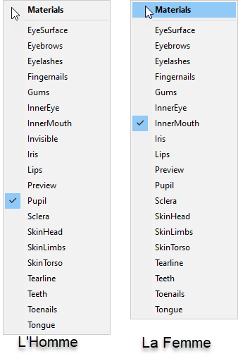 As you can see, the two figures in this image each have different materials lists. Each object in a Poser scene has its own list of materials, which is different for each object.