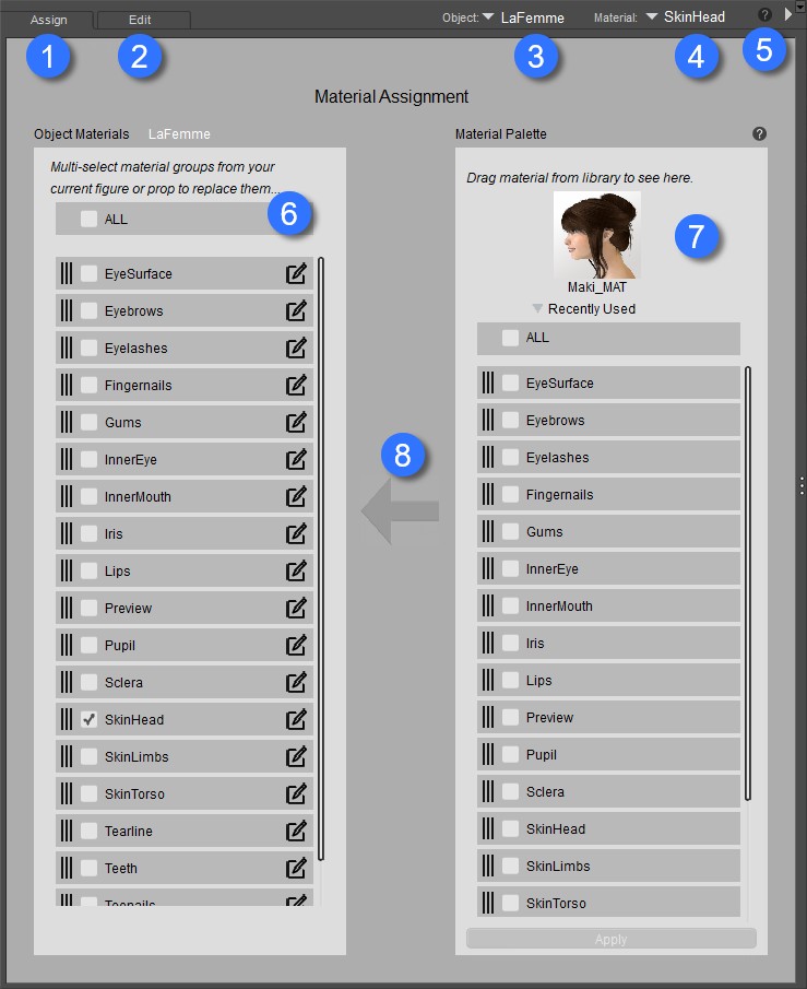 8.Assign Tab: Click this tab to use the Assign view to copy properties from a library material or material collection to the currently selected object. For more information, see Assign View.