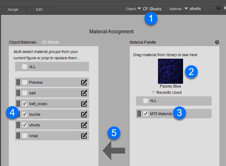 You can also apply MT5 materials to multiple material zones in a figure or object. This shows how to assign a single material to one material in an object. The steps are similar to the above, except that you select two or more materials to apply to in the Object Materials panel.