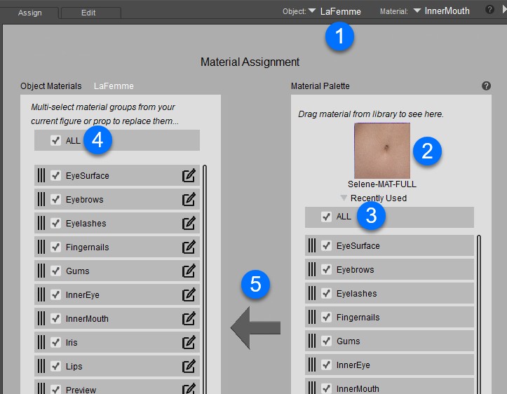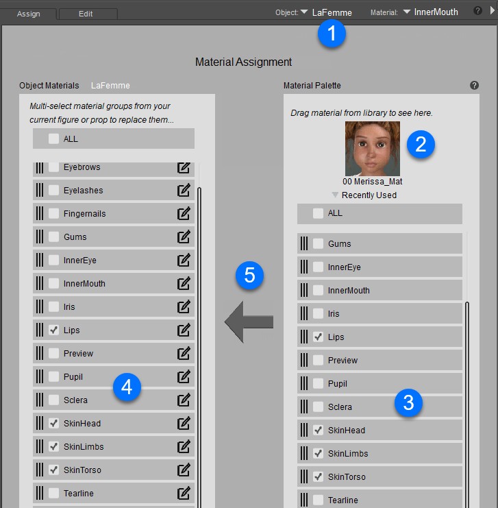 Sometimes you want to keep some materials in your object, but replace others, This is easy enough to do in the Assign tab. For example, if you only want to change the skin and lips on a figure, but keep the eyes, inner mouth, and nails as they are, you would proceed as follows: