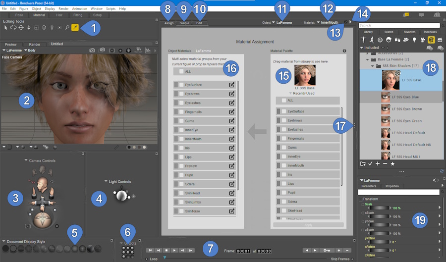 18.Library: The Library window appears in the far left section of the Material room if space permits. See The Poser Library.
