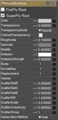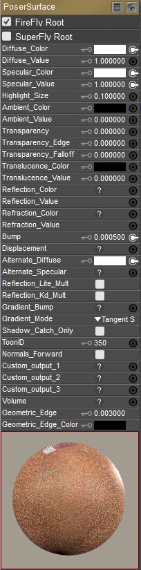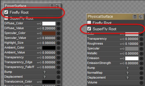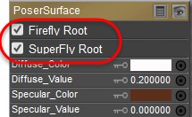Poser provides three different types of material root nodes that work with the FireFly and SuperFly renderers. By default, each material initially uses a PoserSurface node for a new material, in order to maintain backward compatibility to legacy content. The PoserSurface node is initially designated to be sent to both the FireFly and SuperFly renderers.