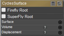 •Superfly Root: If the material also contains a PoserSurface Node or Cycles Surface Node, choose this option if you want the output of this root node to be sent to the SuperFly Renderer.