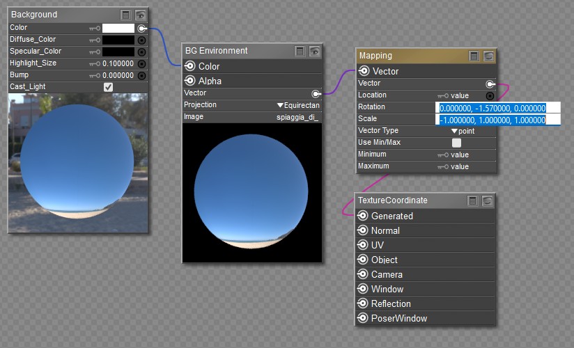 When the environment sphere is included in the scene, open the material editor and choose the Background object in the Material Editor. The preview window will display the HDRI image mapped onto the inside of the environment sphere. The following nodes are connected to the Background root: