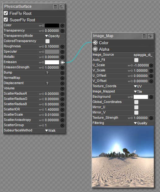 Next, select the Environment Preview from the object menu in the Material room. The same image used in the Background is added to its default material to cast light into the scene. For this, you use an image map node with the same HDRI image assigned. The Color output of the image map is connected to the Emission connection in the Physical Surface root node.