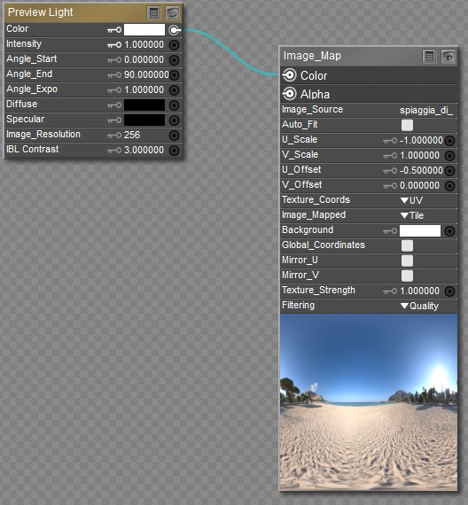 Finally, select the Preview Light object from the Object menu in the material room. This is the third place where the HDRI image is referenced. The HDRI image map node is connected to the Color input of a root light node. Color is set to white, and Diffuse and Specular are set to black on the root light node.
