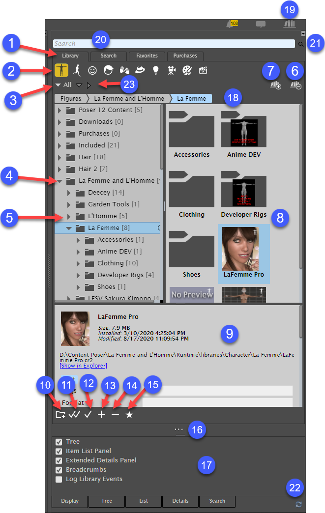 13.Save to Library (+): Appears when a folder is selected. Click this button to add the item that is currently selected in your scene into the library.