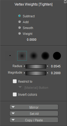 The bottom section of the Vertex Weights palette contains controls that allow you to mirror, copy, paste, and set vertices to specific weights.