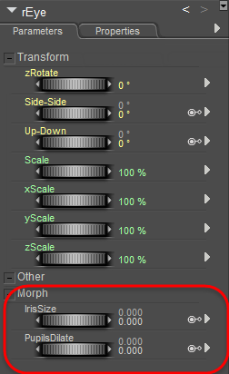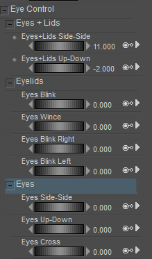 Many Poser figures also have additional morph dials for the eyes, which can vary the shape of the iris and pupil, or which move the eyes up, down, right, or left.