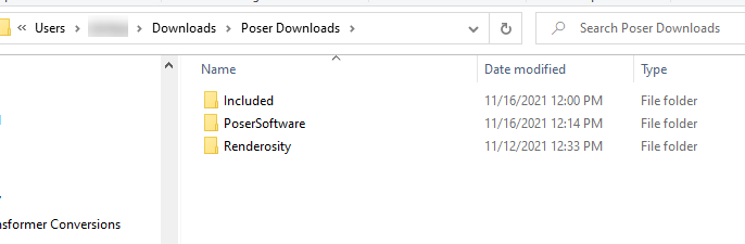 4.The product zip files will download to your Windows Users > username > Downloads folder, in a parent folder named Poser Downloads. There will be subfolders named Included, PoserSoftware, and Renderosity, depending on the type of content you are installing.