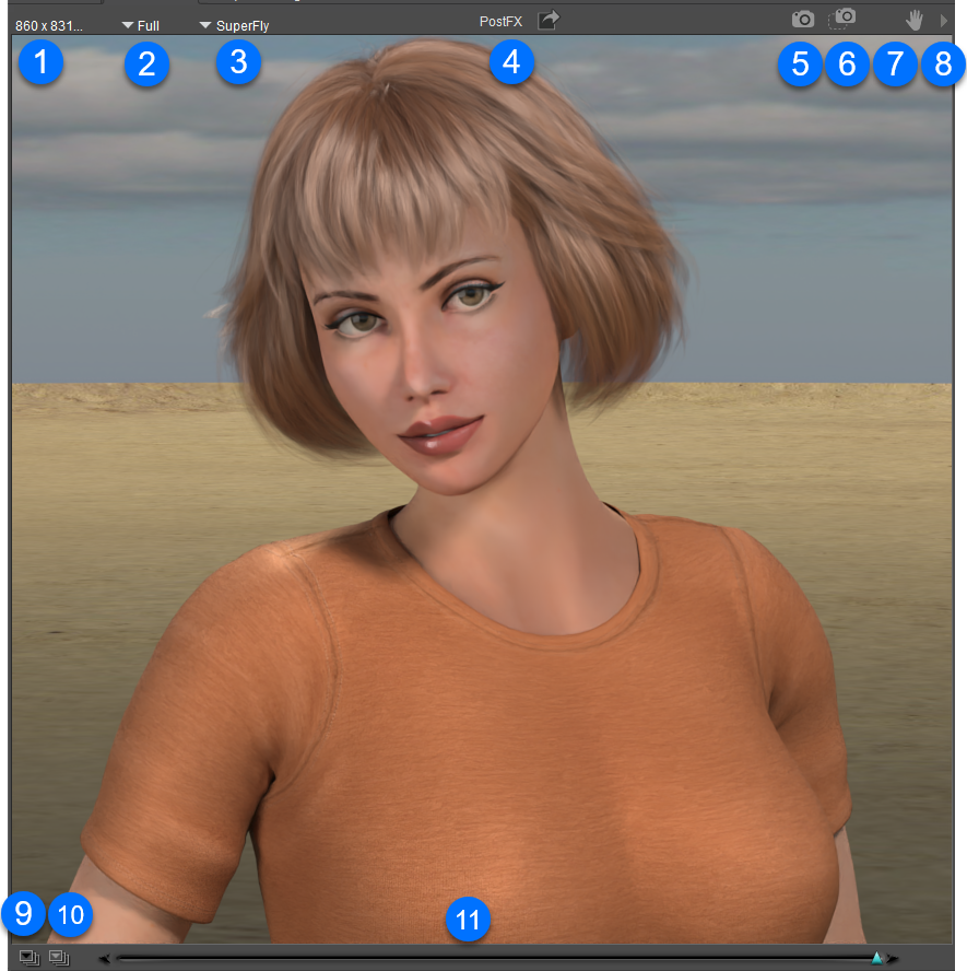 Clicking on the Render tab at the top left of the Document displays the main render window, where you can see the rendered results of your Poser scene. The Render tab contains the following controls which are described in the sections that follow: