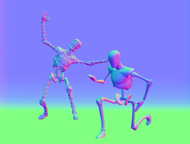 Normal: The world space normal of the frontmost surface, encoded as RGB values with x=red, y=green, z=blue. Normal layers are identified by the letter N in Photoshop.