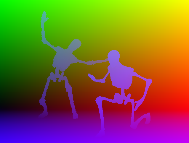 Position: The world space position of the frontmost surface, encoded as RGB values with x=red, y=green, z=blue. Position layers are identified by the letter P in Photoshop.