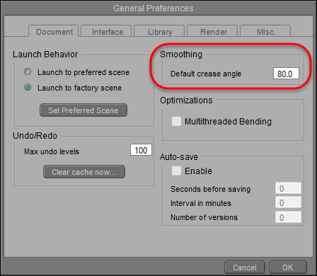 To change the crease angle globally, select Edit> General Preferences, and click on the Document tab.