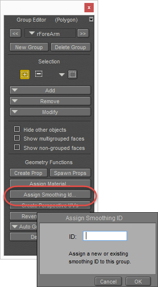 Different polygon groups can be assigned the same Smoothing ID, which will ensure smooth shading across the geometric breaks between groups. To do this, simply create a smoothing ID for the initial group, and then select that same ID from the pop-up list when assigning Smoothing ID’s to the other groups.