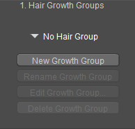Click the New Growth Group button in Area 1 of the Hair room to create a new group called Hair_1 by default. Subsequent hair groups are numbered sequentially (Hair_2, etc.). You can rename groups by entering a new name in the New Growth Group Name box that appears. Click OK to proceed or Cancel to abort.