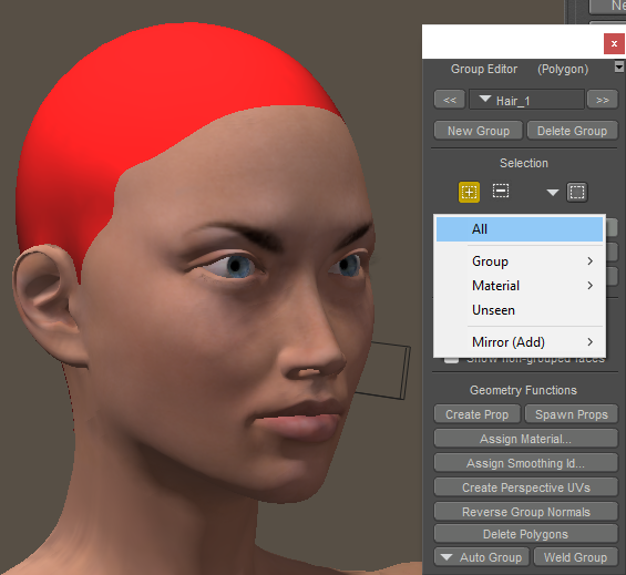 Click the Edit Growth Group button to enable the Grouping tool and open the Group Editor palette. Be sure that you have the correct hair group selected before selecting polygons for the group. Please refer to Creating/Editing Groups for information about using the grouping tools.