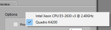 GPU Selection: Select the desired video card for SuperFly rendering from the GPU selection menu that appears above the options in the right pane.