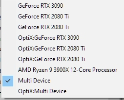 --- Choose OptiX:Multi Device if all of your GPU cards support OptiX. In the example shown above, the RTX2080Ti and RTX 3090 are all OptiX capable cards.