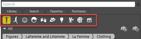 Poser’s hierarchical Library palette provides access to all of the content that ships with Poser such as figures, props, lights, cameras, etc. It has three tabs: the Library tab that provides access to the Poser content categories, the Search tab which allows you to search your content folders for specific files, and the Favorites tab where you can gain easy access to your frequently used or favorite content items. The Library tab contains ten categories, discussed below. Each category is further divided into subcategories. You can create and remove categories and subcategories, and can add and remove content, including your existing content libraries, to/from the Library palette.