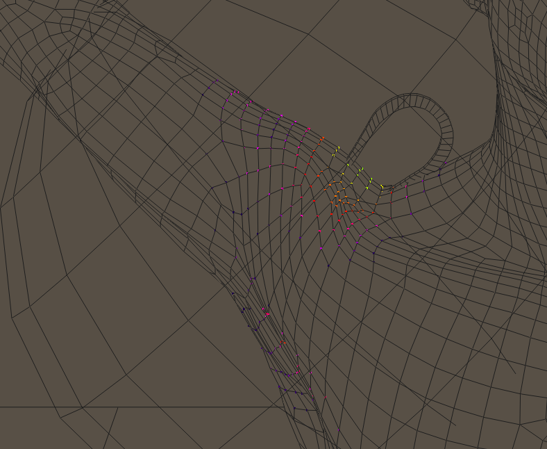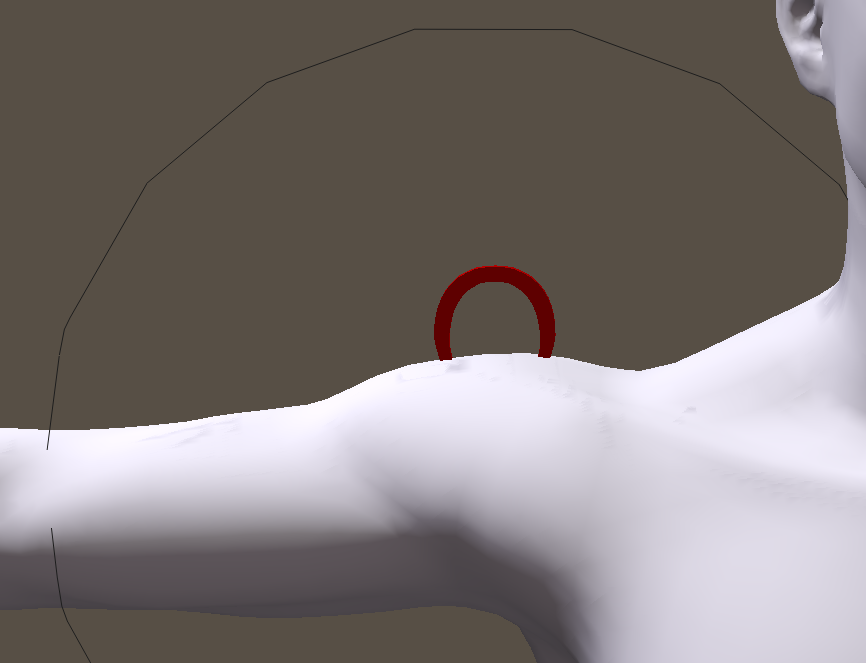 After adding the magnet, the magnet zone is set up to use weight maps. The Poser weight painting tools are used to paint specific vertices that the magnet will affect, and the strength at which they will be affected. The following figure, showing the body part in Hidden Line display mode, shows an example of the vertices that are painted on the upper and lower sections of the shoulder.