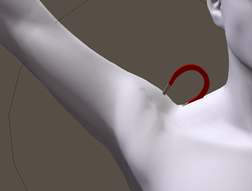 Weight mapped magnets can be used to improve bending when a joint, such as a shoulder, is raised or lowered. The falloff zone for the magnet can affect as few or as many vertices in the geometry as you choose, and you can control the strength at which the vertices are affected. This approach gives you more precise and specific results over using the graph editor that is discussed in Magnet_Zone_Falloff_Graph.