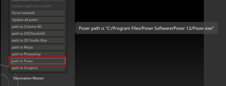 If you hover over the Path to Poser button in ZBrush and get a message that reads Poser application was not found, then you will need to set it up manually. To do this, click on the Path to Poser button. This will initiate a search for your Poser application.