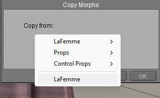 - To copy morphs from another prop clothing item, or from a specific body part on a different conforming clothing item, expand the list that appears to the right of the current clothing item. Choose the body part from which you want to copy the morphs and then click OK to continue.