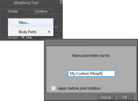 - To create a new morph, select New. You will be prompted to assign a name for the new morph. You will also be prompted to check or uncheck an option to apply the morph before joint rotation. For more information about this feature, see Applying Pre-Transform Morphs.