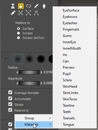 - By default, the Morphing Tool allows you to morph across multiple body parts. You can also restrict painting by group(s) or material(s). To do so, check the Restrict To option and expand the menu to select the group or material that you want to include in the restriction. You can repeat this to include more than one item in the restriction.