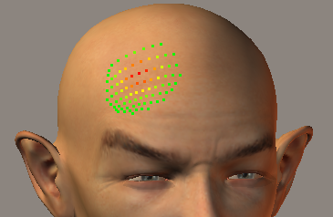- Display Brush: The Display Brush option displays a visual preview of the region you will be impacting with your deformation. This preview uses different colors to indicate the degree to which each area of the impact region will be affected by your selected action. Specifically, red indicates the area most strongly affected, yellow indicates that an area is less strongly affected, and green areas are the least affected within the impact region. The Display Brush option is enabled by default. If you have elected to work on a single group rather than the entire figure, the brush will display only when it is over the group that is selected for editing.