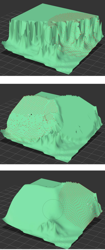The following image shows an irregularly shaped object in three stages: The top image shows the object before it is flattened with the morph tool. The middle image shows the object after a couple of areas have been flattened with the Morph tool. The brush shape used no falloff (the last brush option) and was set to a large size. The third image shows the object after changing the Morph brush to Smooth, and then passed through the rough areas in the center.