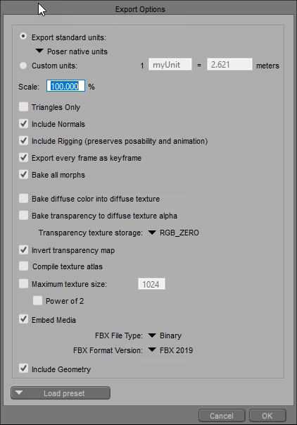 Load Preset: The Load Preset button, located at the bottom of the FBX Export Options dialog, provides a Default preset, as well as preset configurations for export to other popular applications. If you are exporting to one of these specific applications, we recommend that you select the applicable preset first, and then use additional settings as described below.