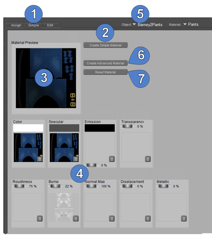 The Simple materials tab in the Material room provides an interface for creating basic materials for Poser. The Simple materials are handled separately from Advanced materials. If you want to use the simple room to edit a material you can import advanced materials. When an advanced material is imported there will likely be functions that are not supported in the Simple tab. Importing an existing material to the Simple tab leaves the existing advanced material intact. The process is non-destructive.
